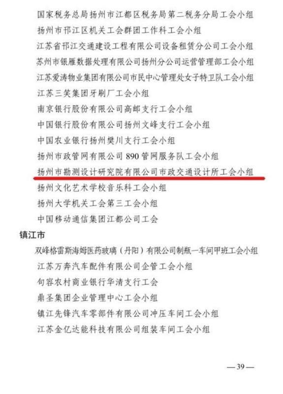 近日,江蘇省總工會印發(fā)《關(guān)于表彰江蘇省模范職工之家、模范職工小家、優(yōu)秀工會工作者的決定》,揚(yáng)州市勘測設(shè)計(jì)研究院有限公司市政交通設(shè)計(jì)所工會小組被江蘇省總工會授予“江蘇省模范職工之家”稱號。